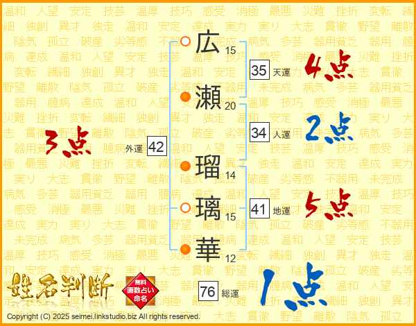 広(15画)瀬(20画) 瑠(14画)璃(15画)華(12画)