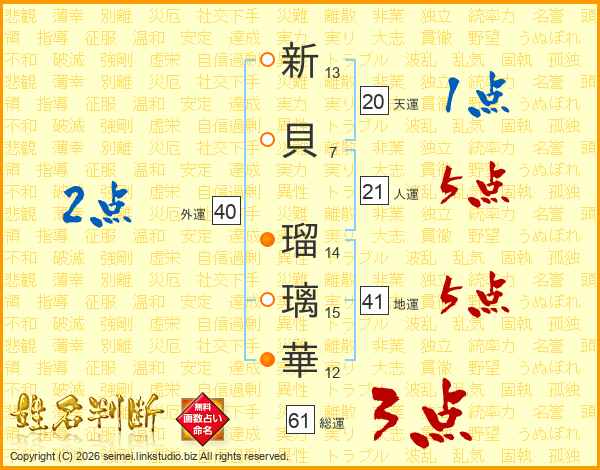 新(13画)貝(7画) 瑠(14画)璃(15画)華(12画)