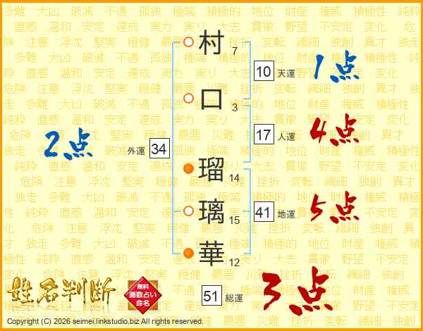 村(7画)口(3画) 瑠(14画)璃(15画)華(12画)