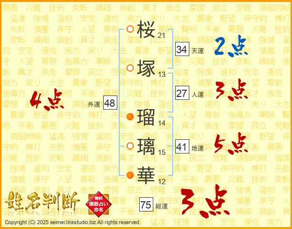 桜(21画)塚(13画) 瑠(14画)璃(15画)華(12画)