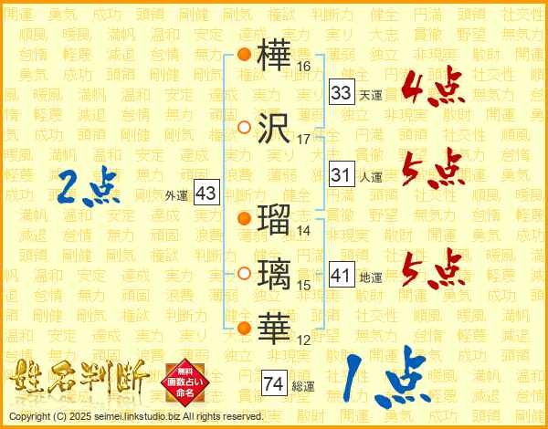 樺沢瑠璃華さんの総運は74画の1点!