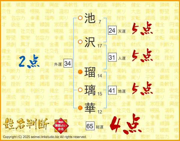 池(7画)沢(17画) 瑠(14画)璃(15画)華(12画)