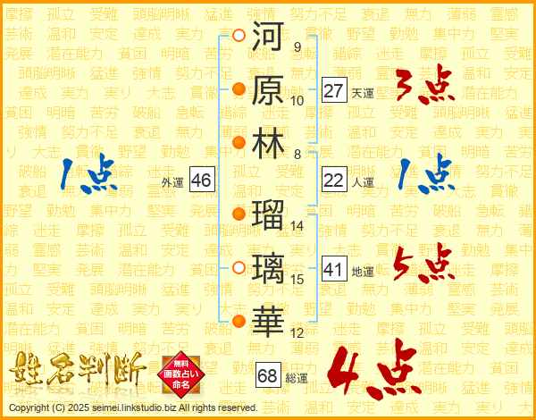河(9画)原(10画)林(8画) 瑠(14画)璃(15画)華(12画)
