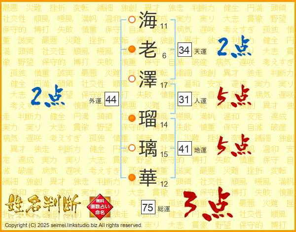 海(11画)老(6画)澤(17画) 瑠(14画)璃(15画)華(12画)