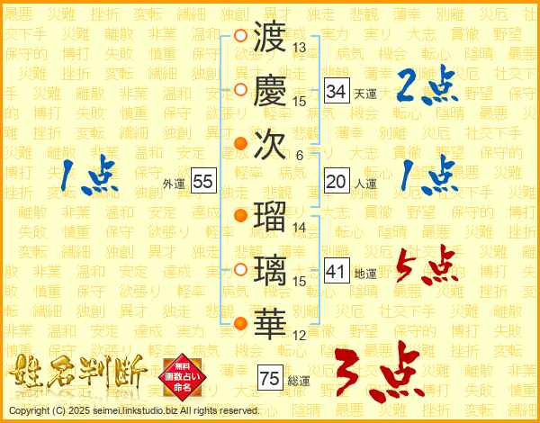 渡(13画)慶(15画)次(6画) 瑠(14画)璃(15画)華(12画)