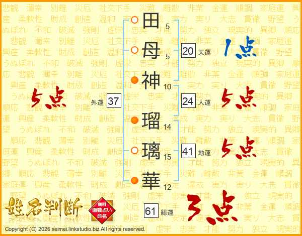 田(5画)母(5画)神(10画) 瑠(14画)璃(15画)華(12画)