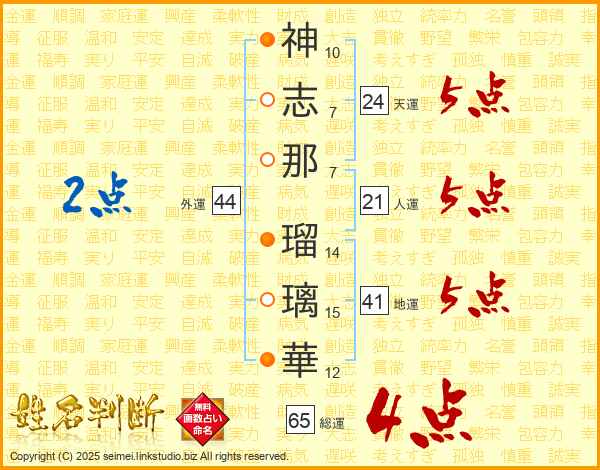 神(10画)志(7画)那(7画) 瑠(14画)璃(15画)華(12画)