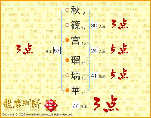 秋(9画)篠(17画)宮(10画) 瑠(14画)璃(15画)華(12画)