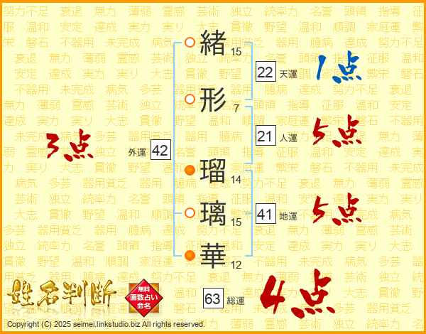 緒(15画)形(7画) 瑠(14画)璃(15画)華(12画)