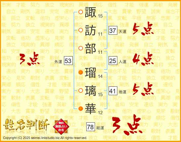 諏(15画)訪(11画)部(11画) 瑠(14画)璃(15画)華(12画)