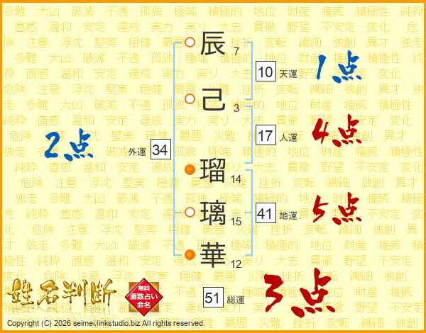 辰(7画)己(3画) 瑠(14画)璃(15画)華(12画)