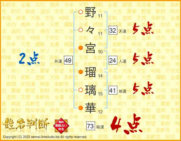 野(11画)々(11画)宮(10画) 瑠(14画)璃(15画)華(12画)