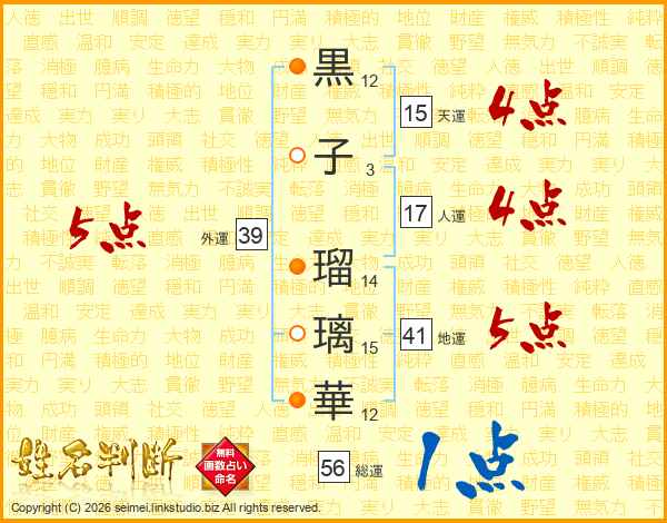 黒子瑠璃華さんの外運は39画の5点!