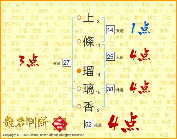 上(3画)條(11画) 瑠(14画)璃(15画)香(9画)