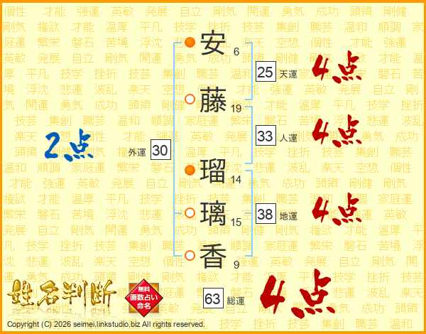 安(6画)藤(19画) 瑠(14画)璃(15画)香(9画)