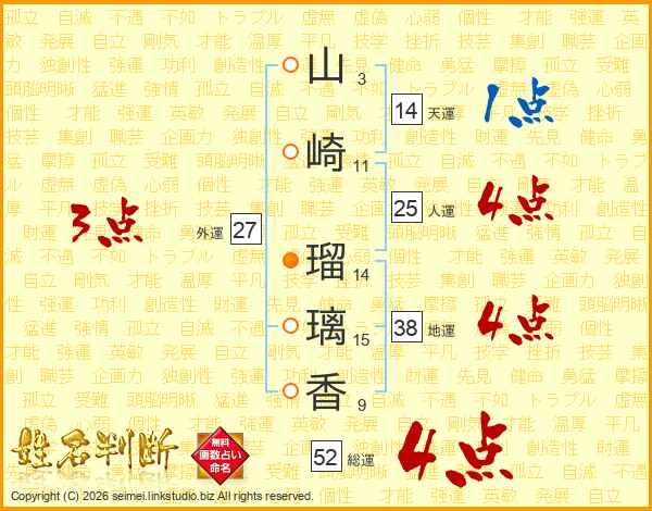 山(3画)崎(11画) 瑠(14画)璃(15画)香(9画)