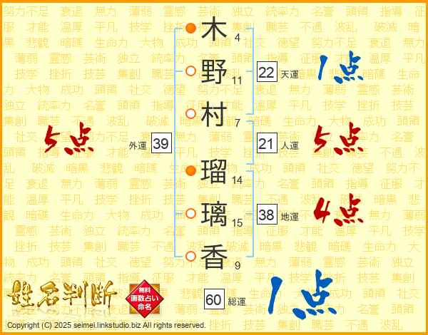 木(4画)野(11画)村(7画) 瑠(14画)璃(15画)香(9画)