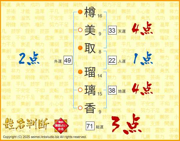 樽(16画)美(9画)取(8画) 瑠(14画)璃(15画)香(9画)