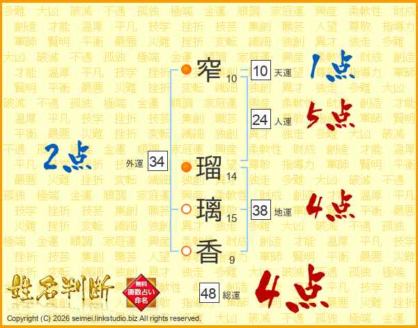 窄(10画) 瑠(14画)璃(15画)香(9画)
