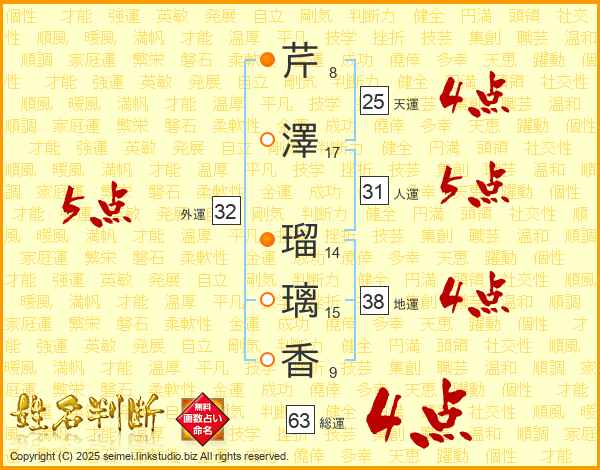 芹(8画)澤(17画) 瑠(14画)璃(15画)香(9画)