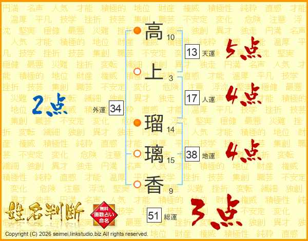 高上瑠璃香さんの総運は51画の3点!