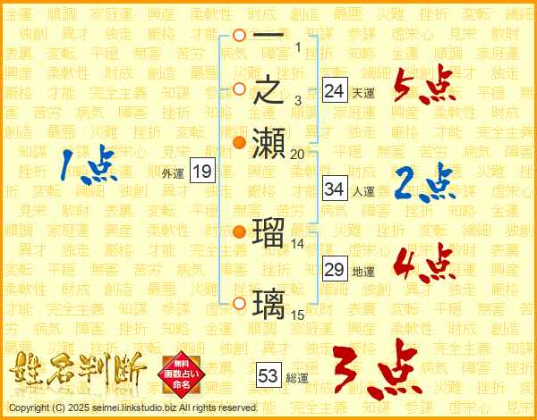 一(1画)之(3画)瀬(20画) 瑠(14画)璃(15画)