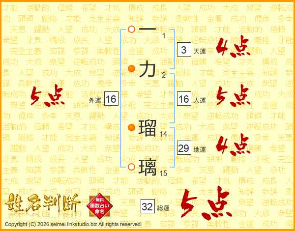 一(1画)力(2画) 瑠(14画)璃(15画)