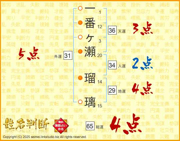 一番ヶ瀬瑠璃さんの総運は65画の4点!
