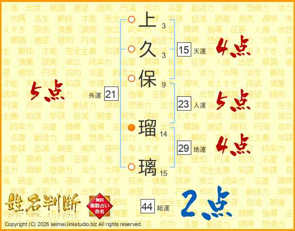 上(3画)久(3画)保(9画) 瑠(14画)璃(15画)