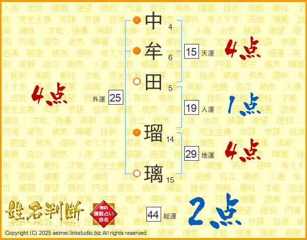 中(4画)牟(6画)田(5画) 瑠(14画)璃(15画)