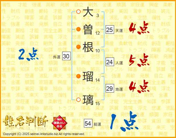 大(3画)曽(12画)根(10画) 瑠(14画)璃(15画)
