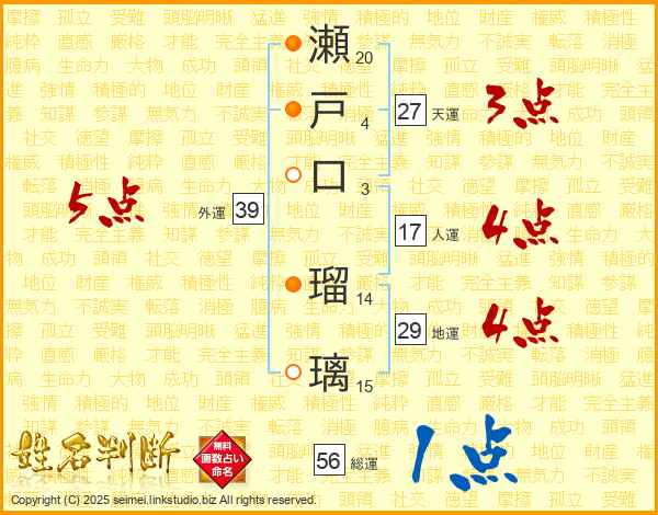 瀬(20画)戸(4画)口(3画) 瑠(14画)璃(15画)