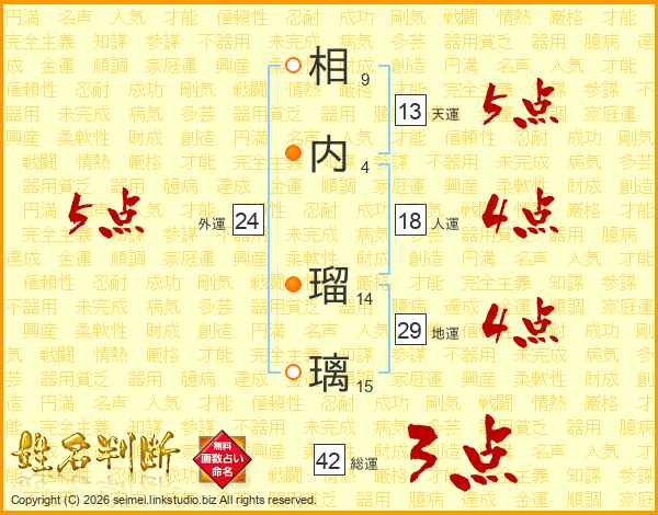 相(9画)内(4画) 瑠(14画)璃(15画)