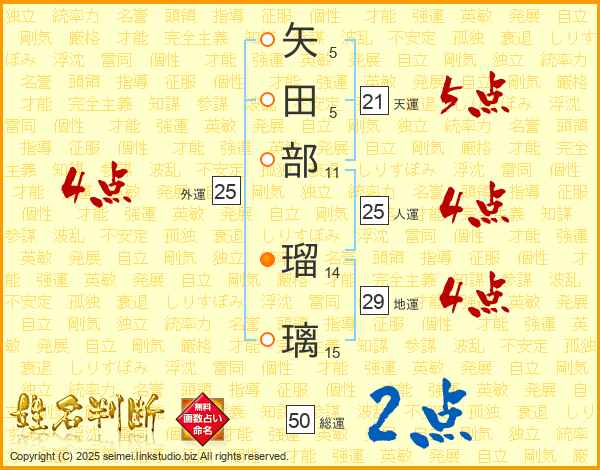 矢田部瑠璃さんの総運は50画の2点!