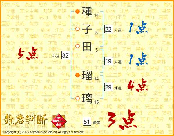 種(14画)子(3画)田(5画) 瑠(14画)璃(15画)