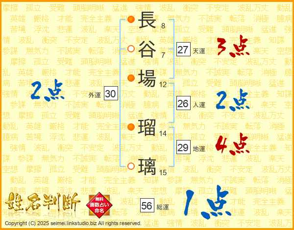 長(8画)谷(7画)場(12画) 瑠(14画)璃(15画)