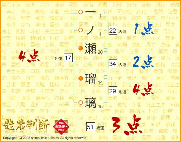一(1画)ノ(1画)瀬(20画) 瑠(14画)璃(15画)
