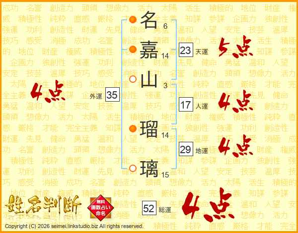 名嘉山瑠璃さんの総運は52画の4点!