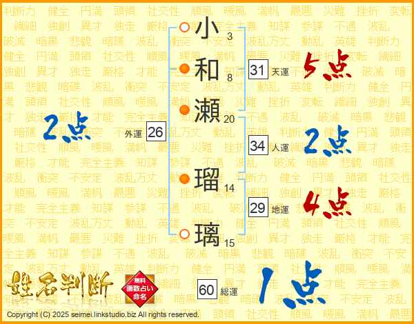 小(3画)和(8画)瀬(20画) 瑠(14画)璃(15画)