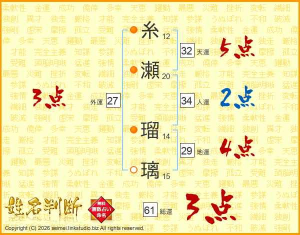 糸(12画)瀬(20画) 瑠(14画)璃(15画)