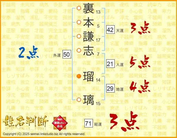 裏(13画)本(5画)謙(17画)志(7画) 瑠(14画)璃(15画)