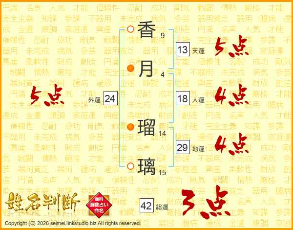 香(9画)月(4画) 瑠(14画)璃(15画)