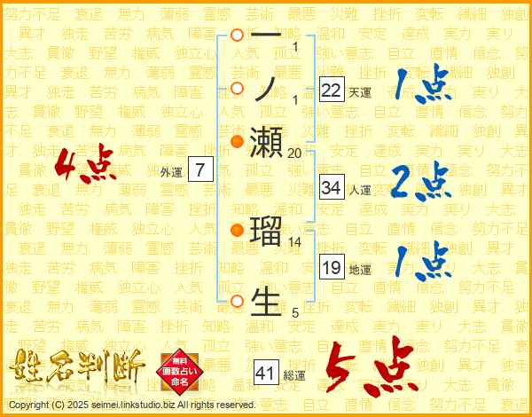 一(1画)ノ(1画)瀬(20画) 瑠(14画)生(5画)