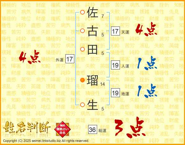 佐(7画)古(5画)田(5画) 瑠(14画)生(5画)