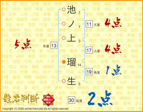 池(7画)ノ(1画)上(3画) 瑠(14画)生(5画)