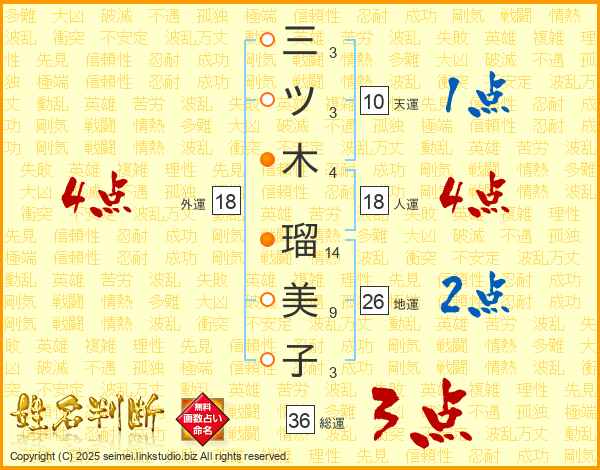 三(3画)ツ(3画)木(4画) 瑠(14画)美(9画)子(3画)