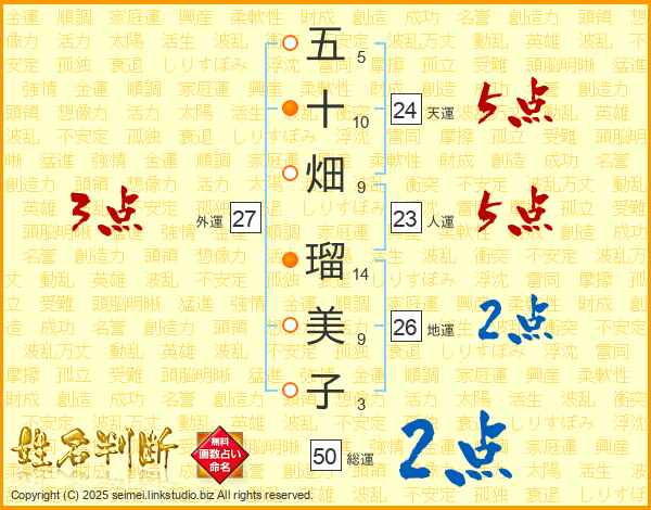 五(5画)十(10画)畑(9画) 瑠(14画)美(9画)子(3画)