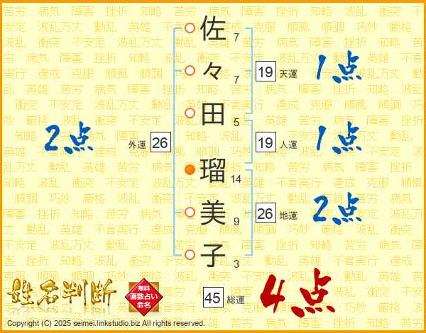 佐(7画)々(7画)田(5画) 瑠(14画)美(9画)子(3画)