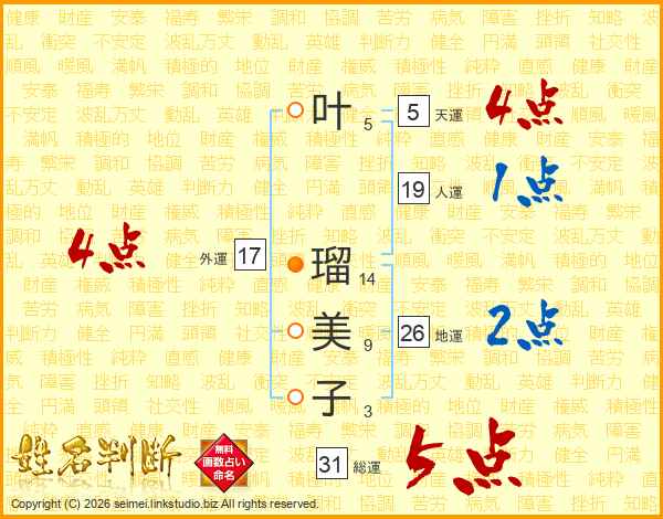 叶(5画) 瑠(14画)美(9画)子(3画)