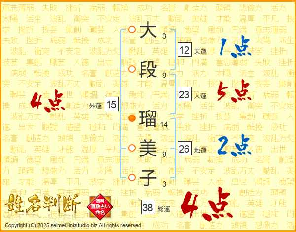 大(3画)段(9画) 瑠(14画)美(9画)子(3画)